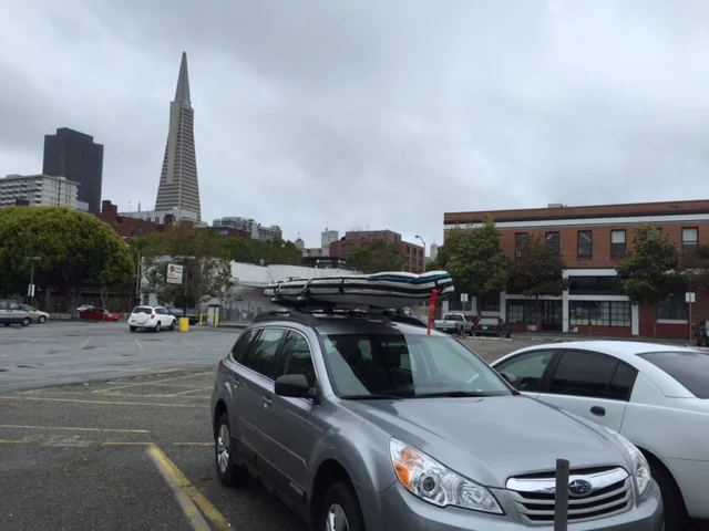 Lately I've spent more time commuting than in the water, so it's been a bit frustrating. On Thursday, I took this photo to help illustrate my point. A car in the middle of San Francisco, with its board out of water! Hopefully the owner got to the beach later that day.